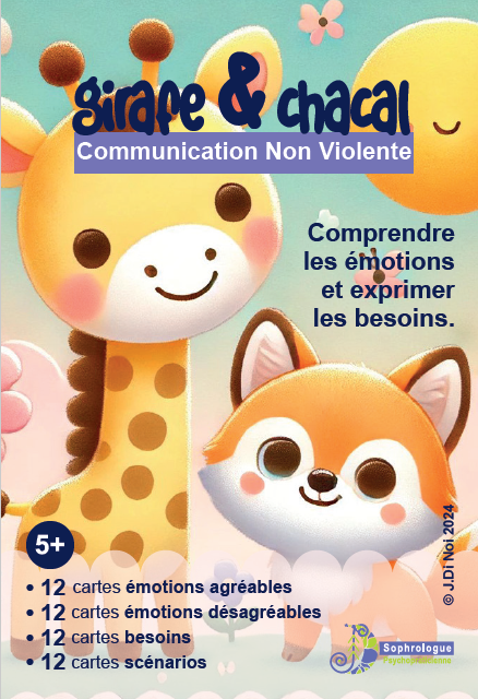 Aidez vos enfants à mieux comprendre et pratiquer la communication bienveillante grâce à ces cartes de Communication Non Violente inspirées des célèbres personnages de la girafe et du chacal. Ces cartes ludiques et éducatives sont conçues pour enseigner aux enfants les bases de la communication non violente (CNV) de manière accessible et amusante.